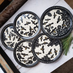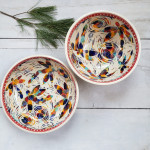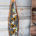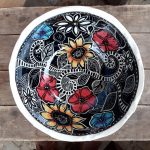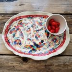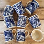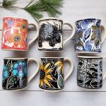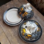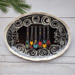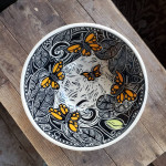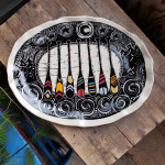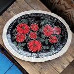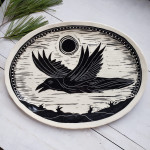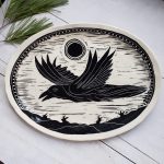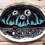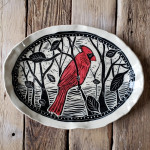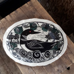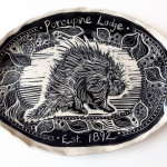 Using Sgrafitto technique, Karen carves detailed images into functional pottery and artistic wall hangings. Karen’s designs are inspired by life on the Canadian Shield and range from brightly coloured dragonflies, to woodland critters, canoes, northern lights to floral designs of poppies and sunflowers. This technique of carving images into clay allows Karen to specialize in custom orders, including custom cottage platters and personalized wedding gifts.